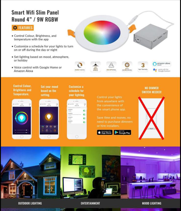 10W LED Round Panel provides high quality light output, provides 700-720 lumens and consumes just 10W (60W Fluorescent Equivalent), voltage of 110V RGBW+CCT Changeable.